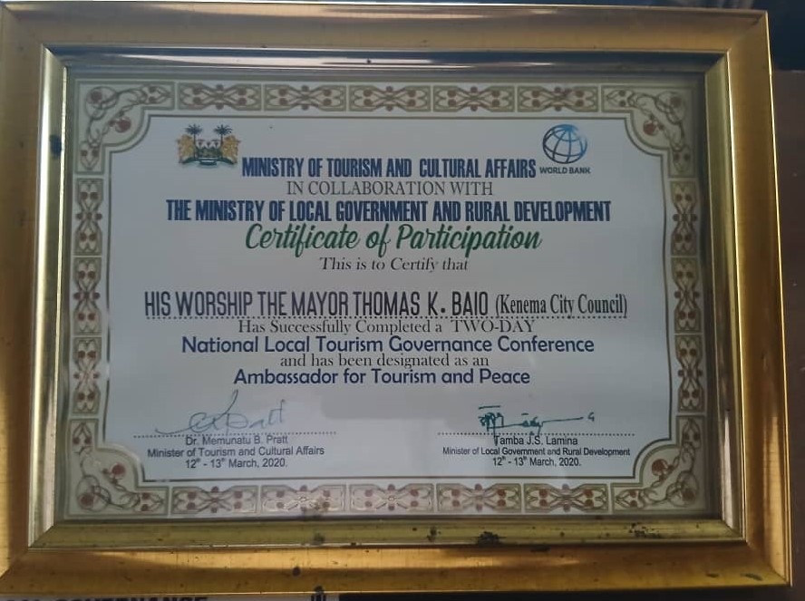 The 2021 Award from the Ministry of Tourism for his contributions to promoting Kenema City.